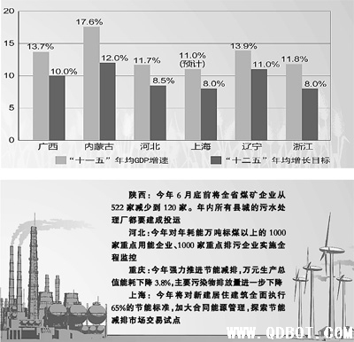 资料图:当前,重庆、西藏、河北、福建、甘肃等20多个省(市、区)两会陆续召开。各地在两会期间所作的政府工作报告以及十二五规划纲要(草案)中,纷纷提出了2011年以及未来5年经济社会发展的主要预期目标。降低经济增速、节能减排、结构调整、发展战略性新兴产业,已成为很多地方谋发展、促转变的共识。制图:蔡华伟