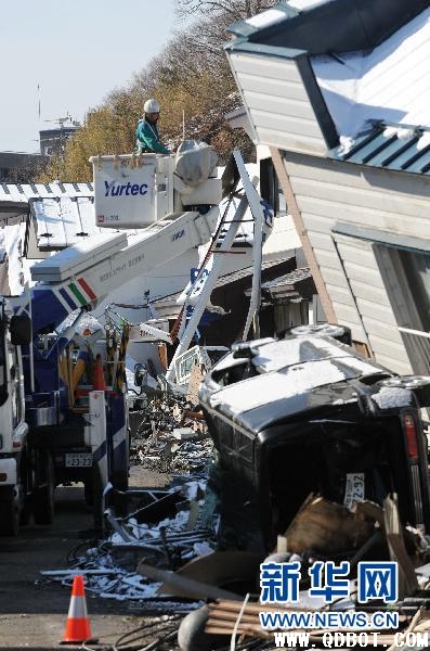 3月17日,工人在日本岩手县废墟上处理在地震和海啸中破坏的电力设施。新华社/法新