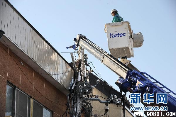 3月17日,工人在日本岩手县废墟上处理在地震和海啸中破坏的电力设施。日本经济产业省当日警示,受降温等因素影响,从当天傍晚开始东京电力公司的电力供应可能跟不上需求,包括东京在内的地区不排除大规模停电的可能。新华社/法新