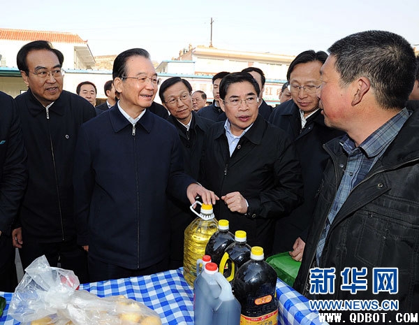 这是4月3日,温家宝在临县城北瓜果蔬菜综合市场了解农副产品供应和价格情况。 新华社记者 李涛 摄