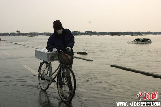 3月11日日本大地震之后,部分遭受海啸倾袭的地区海啸积水仍未退去。图为宫城县东松岛市一个镇被积水分成两截,人们不得不横穿积水过到这边的镇。中新社发 孙冉 摄