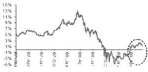 其次,资本项目下的管制将抑制权益投资资金大规模流入国内。尽管从WFII资金的流向部分能够解释权益资金看好亚洲新兴市场的发展,但是我们认为由于中国的资本管制,权益资金并不能够大规模流入国内。这从人民币兑美元的远期汇率和当期利率差即可看到,除金融危机前后的部分时段,资本项目自由兑换的欧元和日元的远期汇率市场并不存在明显的套利机会,而人民币的NDF市场则明显存在持续的和大幅度的套利机会,这主要是由于人民币严格的资本管制造成的,而这在资本项目完全开放的欧洲和日本就很难存在。此外,从过往的经验来看,中国股市的投资收益往往和短期外币资金没有明显的相关度。于是,我们几乎可以认为,以资本市场为主要投资目标的短期外币资金难以大规模进入国内市场,而只有以真实交易为背景的企业资金才有可能成为短期外币资金的主要来源。
