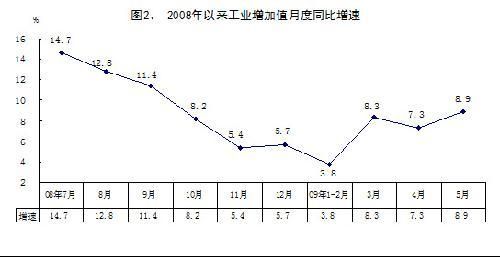 (二)从工业生产走势看,规模以上工业增加值去年6月份增长16%,此后逐月明显下滑,11、12月分别仅增长5.4%和5.7%,今年1-2月进一步减缓为3.8%。从3月份开始,呈现出较为明显的波动回升态势。3、4、5月份分别增长8.3%、7.3%和8.9%,5月份增速基本恢复到去年10月份水平。从有关部门初步测算的季度环比情况看,去年4季度环比下降3.4%,今年1季度环比上升3.2%。进一步分析,分行业看,5月份,39个大类行业中,29个行业比4月份加快或由负转正,31个行业比一季度加快或由负转正,其中比4月份和一季度均加快或由负转正的有25个行业。分地区看,20个地区比4月份加快(或由负转正或降幅缩小),26个地区比一季度加快(或由负转正或降幅缩小),20个地区比4月份和一季度均加快(或由负转正或降幅缩小)。分产品看,在494种产品中有近6成的产品产量增速比4月份加快。工业运行走势表明,此轮经济的底部应该在去年11、12月和今年1、2月份。