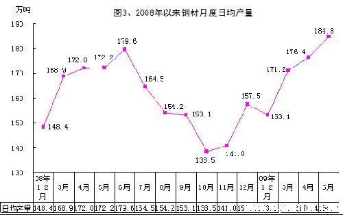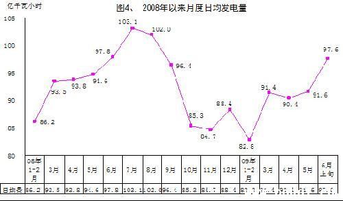 (三)从主要工业产品看,全国钢材日产量去年10月为全年最低水平,日均水平为138.5万吨,11月份为141万吨,从12月份开始呈现波动上升的势头,5月份达到184.8万吨,为去年以来最高水平。全国日平均发电量从去年7月份的103.1亿千瓦小时高点直线回落到10月份的85.3亿千瓦小时,今年1-2月份进一步下降为82.8亿千瓦小时。从今年3月份以后,开始有所回升,3、4、5三个月都超过90亿千瓦小时,6月上旬已接近100亿千瓦小时。