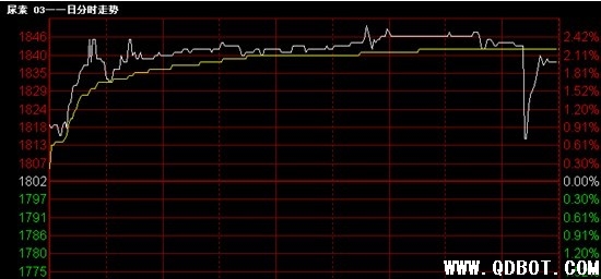 今日青岛国际商品交易所尿素合约1103,1797元/吨开盘,价格急速拉升,继续破高1849元/吨。在1840元/吨附近开始盘整,多空交织势力均衡,横盘时间较长。尾盘伴随部分平仓,价格下落,收于1838元/吨。