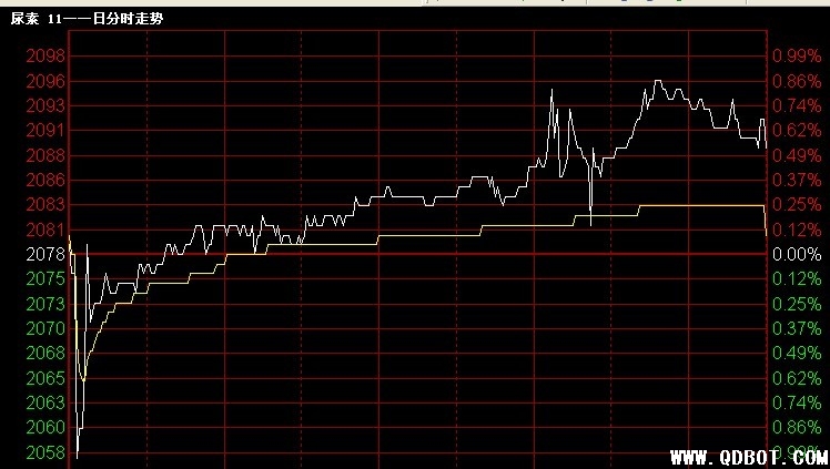 今日青岛国际商品交易所尿素合约CN1111,2080元/吨开盘,早盘价格下压最低2053元/吨,多头依然强势拉动,价格逼近2100元/吨,收于2089元/吨,成交108100吨,增仓200吨。