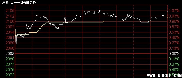 今日青岛国际商品交易所尿素CN1111,2091元/吨开盘,最低2088元/吨,价格盘上打破2100元/吨,最高2106元/吨,收于2105元/吨,成交103760吨,减仓1100吨。