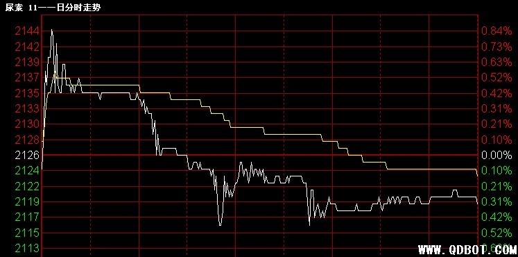 今日青岛国际商品交易所尿素合约CN1111,2130元/吨开盘,价格上冲受阻,最高2144元/吨,价格跌落,午后稳定在2120元/吨附近震荡,收于2119元/吨,成交95580吨,减仓240吨。