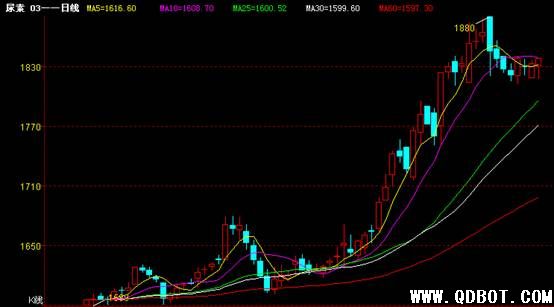 青岛国际商品交易所尿素主力合约CN1003,1830元/吨开盘,借助现货市场这周价格下落形势,空头早盘把握主动打压,成一边倒形势,最低1817元/吨,午后多头开始抵抗下跌,并一度强势拉升,尾盘收于最高1838元/吨,成交11838手,减仓142手。