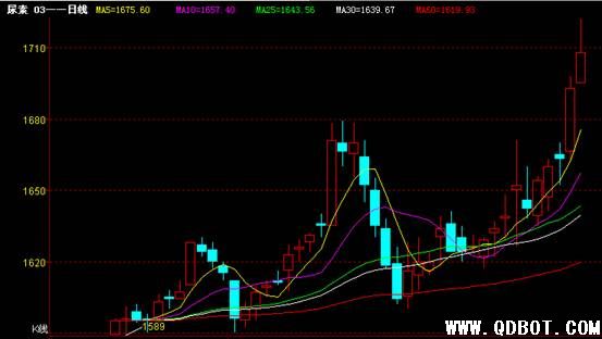 今日青岛国际商品交易所尿素主力合约CN1003,1695元/吨高开,多头一鼓作气上破1700元/吨,最高1722元/吨,然后震荡回落收于1708元/吨,放量成交17636手,减仓298手。