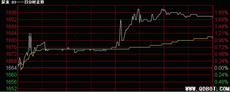 今日青岛国际商品交易所尿素主力合约CN1003,1666元/吨小幅高开,早盘下探1663元/吨,获得现货支撑,价格很快上扬1684元/吨,小幅回落,午盘后多空再次发力飙升最高1698元/吨,尾盘收于1693元/吨,成交13772手,增仓270手。
