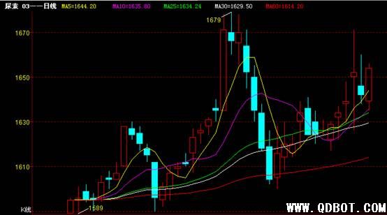 今日青岛国际商品交易所尿素主力合约CN1003,1639元/吨低开,下落1635元/吨,多头近两天积蓄力量,今天开始发力,震荡上行,把前2天的回落再次拉升,重回1650元/吨之上,收于1654元/吨,成交11982手,增仓150手。