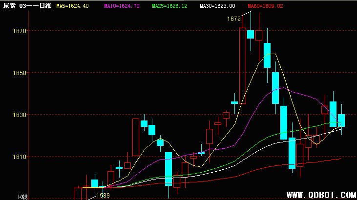 今日青岛国际商品交易所尿素主力合约CN1003,1630元/吨开盘,最高1635元/吨,最低1620元/吨,成交18246手,增仓306手。今日早盘价格波动幅度较大,全天震荡格局,引线下挫30日均线,近期调整范围不会太大。