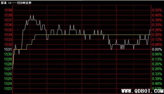 青岛国际商品交易所尿素主力合约CN0911,以1530元/吨开盘,最低1527元/吨,多头发力反弹,一路高升,触及1538元/吨,收盘在1535元/吨,小幅收阳,成交25694手,减仓1460手。