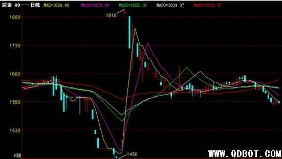 今日青岛国际商品交易所尿素主力合约1009,1590元/吨开盘,窄幅震荡,最高1592元/吨,最低1585元/吨,多空交易分歧较小,价格有所稳定,但是仍然没能看到利好的消息。K线上收于1587元/吨,未能上破5日均线,可能近期构筑调整平台,成交101344手,减仓960手。